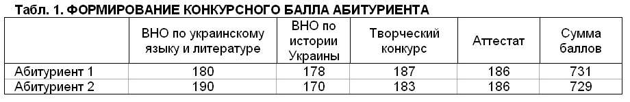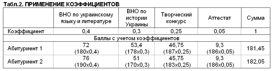 В таких условиях выше шанс поступить в учебное заведение у Абитуриента 1, поскольку его балл выше. Если же конкурсный балл будет рассчитываться с учетом коэффициентов, и вуз правилами приема предусмотрит, что самый высокий коэффициент будет присваиваться результату ВНО по украинскому языку и литературе (0,4) и истории Украины (0,3), то студентом станет Абитуриент 2, поскольку его конкурсный балл - 182,05 - выше, чем у Абитуриента 1 - 181,45. Для определения конкурсного балла мы умножили каждую его составляющую на соответствующий коэффициент, учитывая допустимый вес.