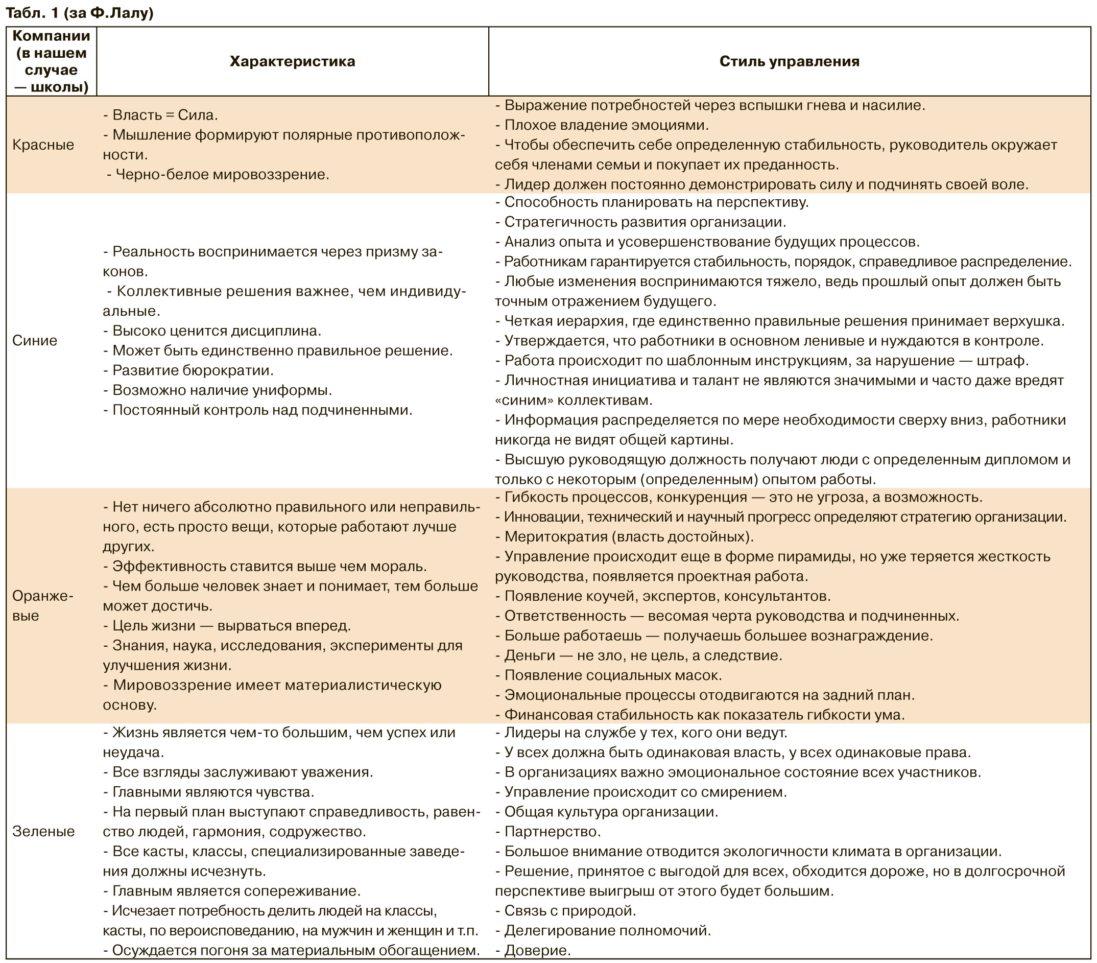 Фредерик Лалу в своей работе "Компании будущего" описывает развитие и стиль менеджмента компаний с разными ценностными ориентирами, поскольку с каждым новым этапом развития человеческого сознания происходит прорыв в способности к сотрудничеству. Можно попытаться перенести такие модели на общеобразовательные учреждения.