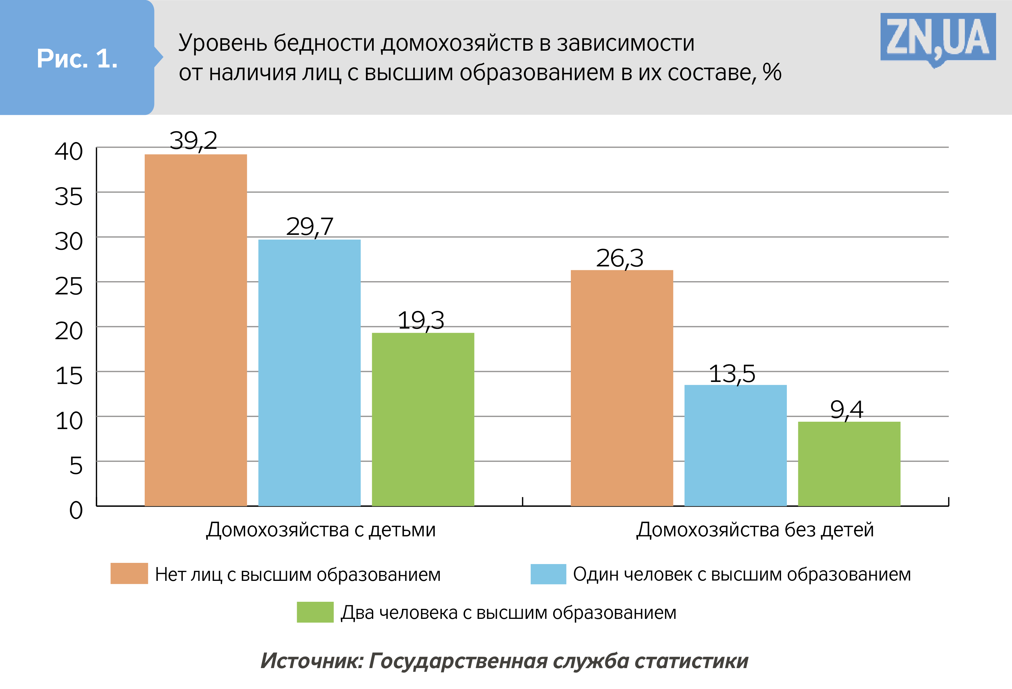 Действительно, человек с высшим образованием способен не только улучшить свои жизненные шансы, но и «вытянуть» свое домохозяйство из бедности. И чем больше членов семьи имеют высшее образование, тем ниже риски бедности. По крайней мере об этом свидетельствует исследование проблем бедности и неравных возможностей детей, проведенное Институтом демографии и социальных исследований им. М.Птухи НАН Украины и Украинским центром социальных реформ совместно с ЮНИСЕФ в Украине. Оно основывается на официальном статистическом наблюдении. То есть домохозяйство, где есть лицо с высшим образованием, в полтора раза реже становится бедным, чем то, в котором таких лиц нет. А вот о чем свидетельствуют результаты обследования условий жизни домохозяйств, проводимого Государственной службой статистики Украины с 1999 года.