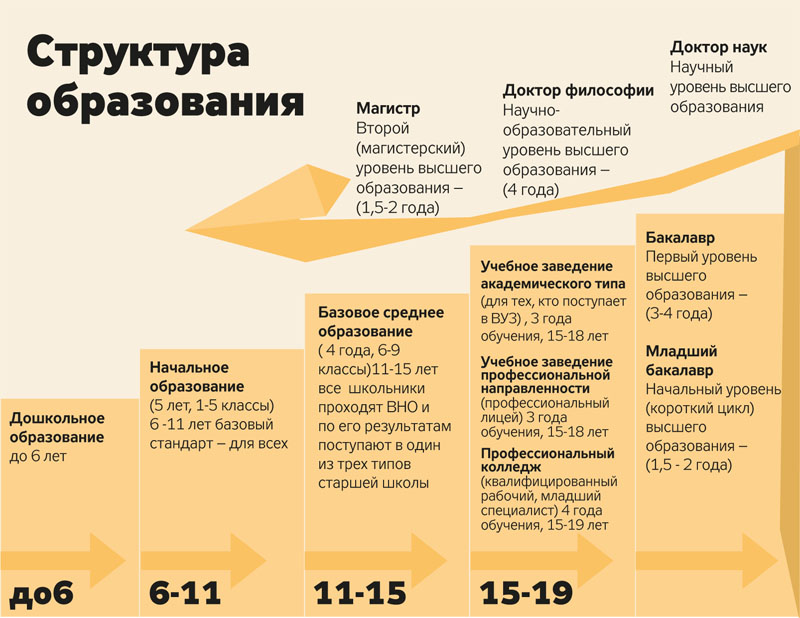 Разработчики проекта Закона об образовании выбирали между двумя вариантами: 5+4+3 года (соответственно, начальная, средняя и старшая школа) и 6+3+3. В конце концов остановились на первом. Поскольку он показался "менее травматичным" и более близким к нынешней структуре образования. Новый закон будет фокусировать внимание на образовании на протяжении жизни, и школьное обучение рассматривается именно в этом контексте. Предлагается четко структурированная школьная система, привязанная к возрасту ребенка.