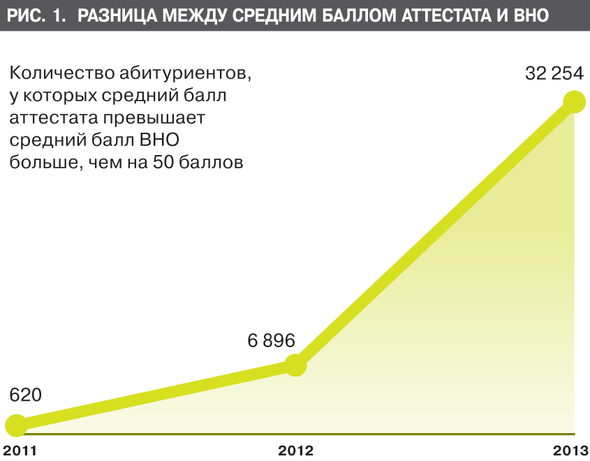 На Международной научно-методической конференции "Образовательные измерения - 2013" В. Ковтунец (Альянс USETI) и Л.Середа (НАПНУ) презентовали данные исследований группы экспертов, подтверждающие: с каждым годом разрыв между средним баллом ВНО, который показывает уровень знаний абитуриента, и средним баллом аттестата все увеличивается (см. рис.1).