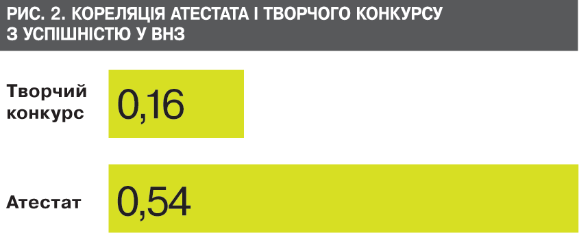 Вот пример из исследования, проведенного среди будущих журналистов. В 2009 г. эксперты сравнили балл, который абитуриент получил за творческий конкурс, и его же средний балл в сессию в первый год обучения. Так же сравнили и средний балл аттестата. Кстати, в 2009 году он не учитывался при поступлении. Как видно, взаимосвязь (коэффициент корреляции) аттестата с успеваемостью в вузе была высокой. А с результатами творческого конкурса - нет (см. рис.2).