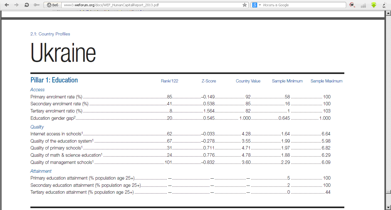 Если откроем раздел "Образование" на странице Украины в Отчете о человеческом капитале, увидим, что в нем, как и в Отчете о конкурентоспособности, нет заявленного министром критерия "использование ИКТ в учебном процессе". Зато есть "подключение школ к Интернету". Здесь у нас рост со знаком "минус" и 62-е место из 122. Для сравнения: в Отчете о конкурентоспособности - 70-е место из 148.