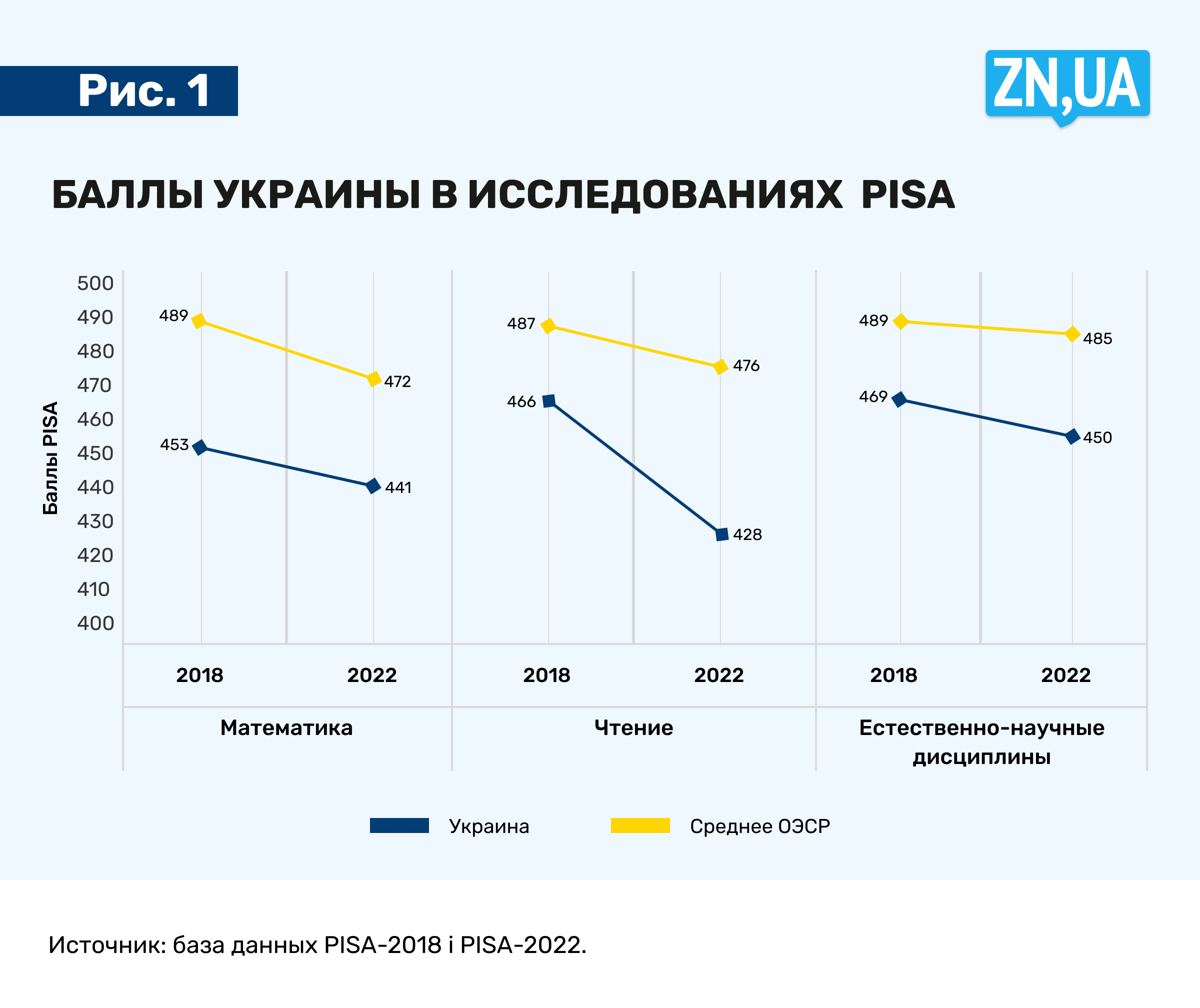 Так, согласно результатам, по математике и естественно-научным дисциплинам наши подростки отстают от своих сверстников из стран ОЭСР на 1,5 года обучения. В случае чтения разница между украинскими детьми и их сверстниками составляет 2,5 года.
