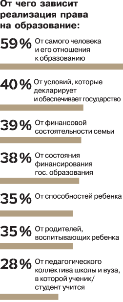 Все группы опрошенных низко оценили роль педагогического коллектива в реализации права на образование. Меньше всего голосов в поддержку этой позиции дали сами педагоги и студенты. Благосклоннее отнеслись к указанному фактору родители и преподаватели вузов.