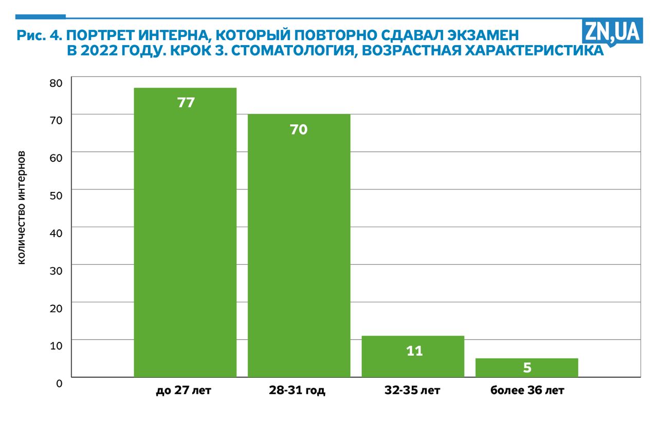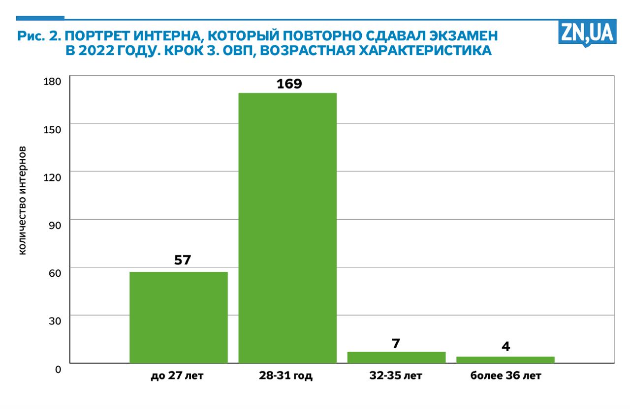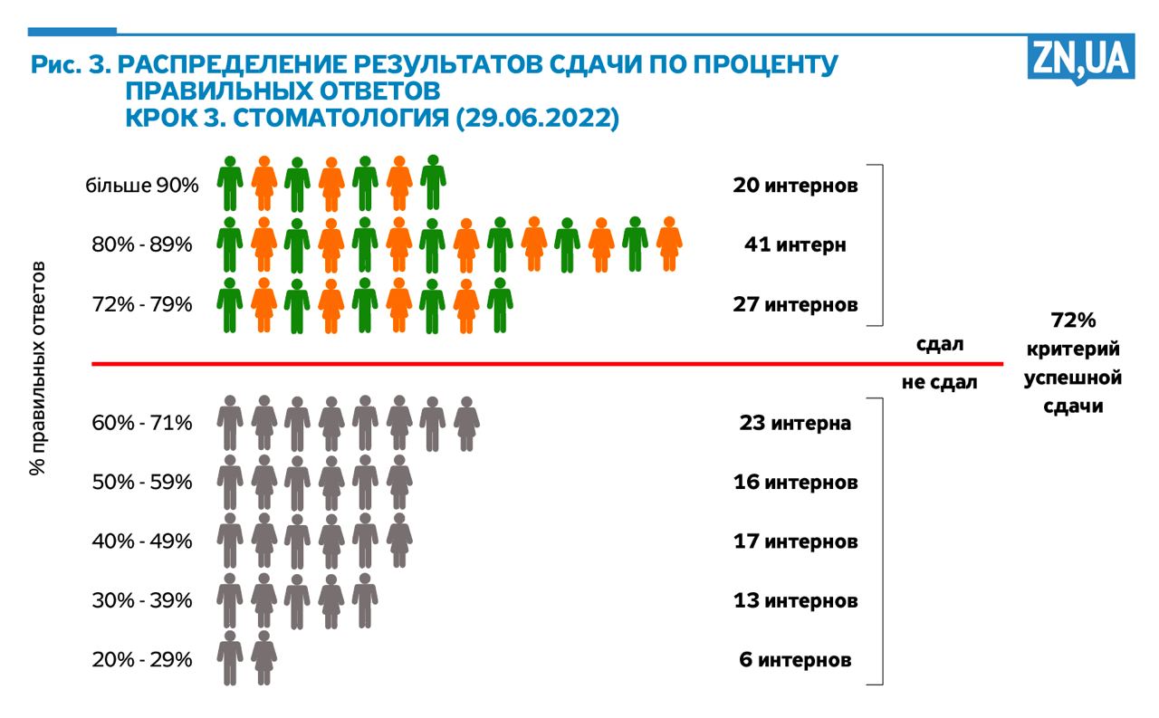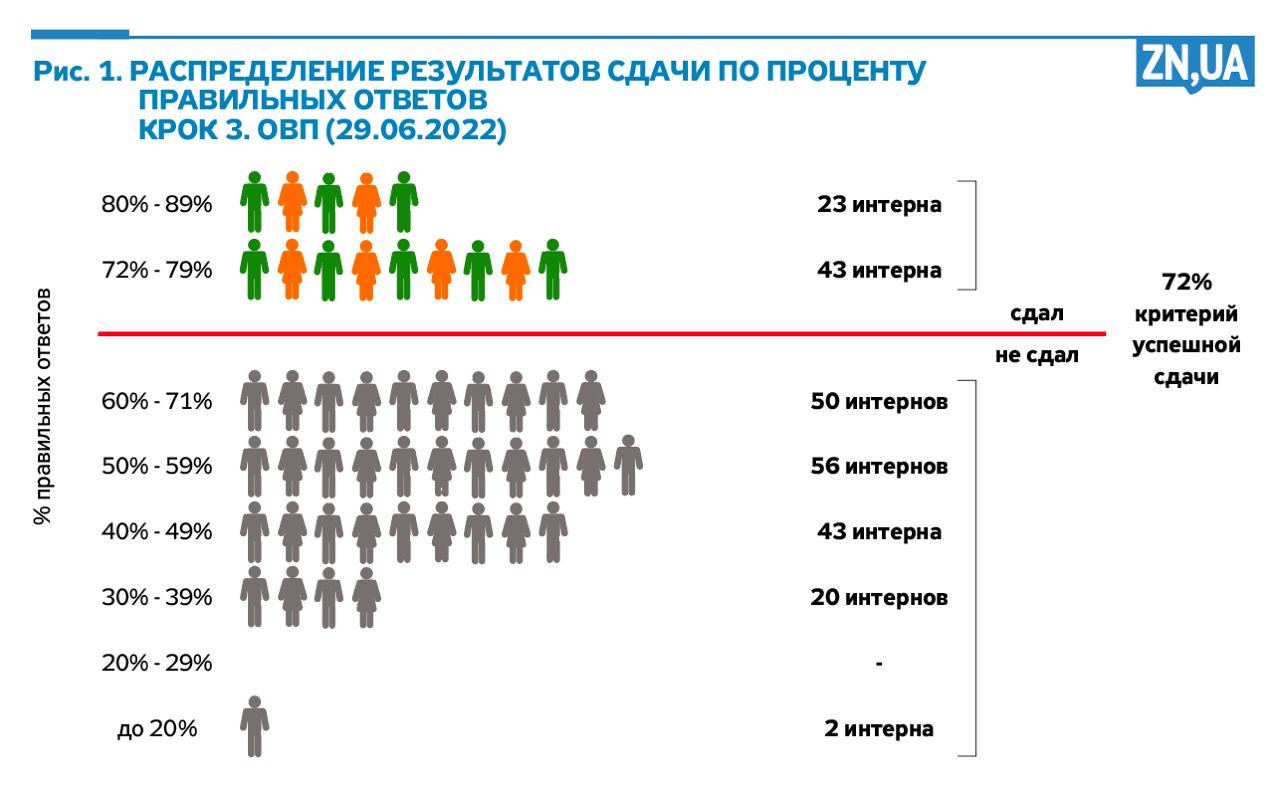 По имеющимся аналитическим материалам, размещенным на сайте ГНП «Центр тестирования» по результатам повторной/дополнительной сдачи экзаменов «Крок 3», проходившей 29.06.2022, можно сделать следующие выводы: из 237 интернов-медиков, которые в предыдущие годы не смогли успешно сдать экзамен и пришли повторно, успешно сдали его 66 интернов. 171 в который раз не смогли набрать даже минимальный проходной балл.