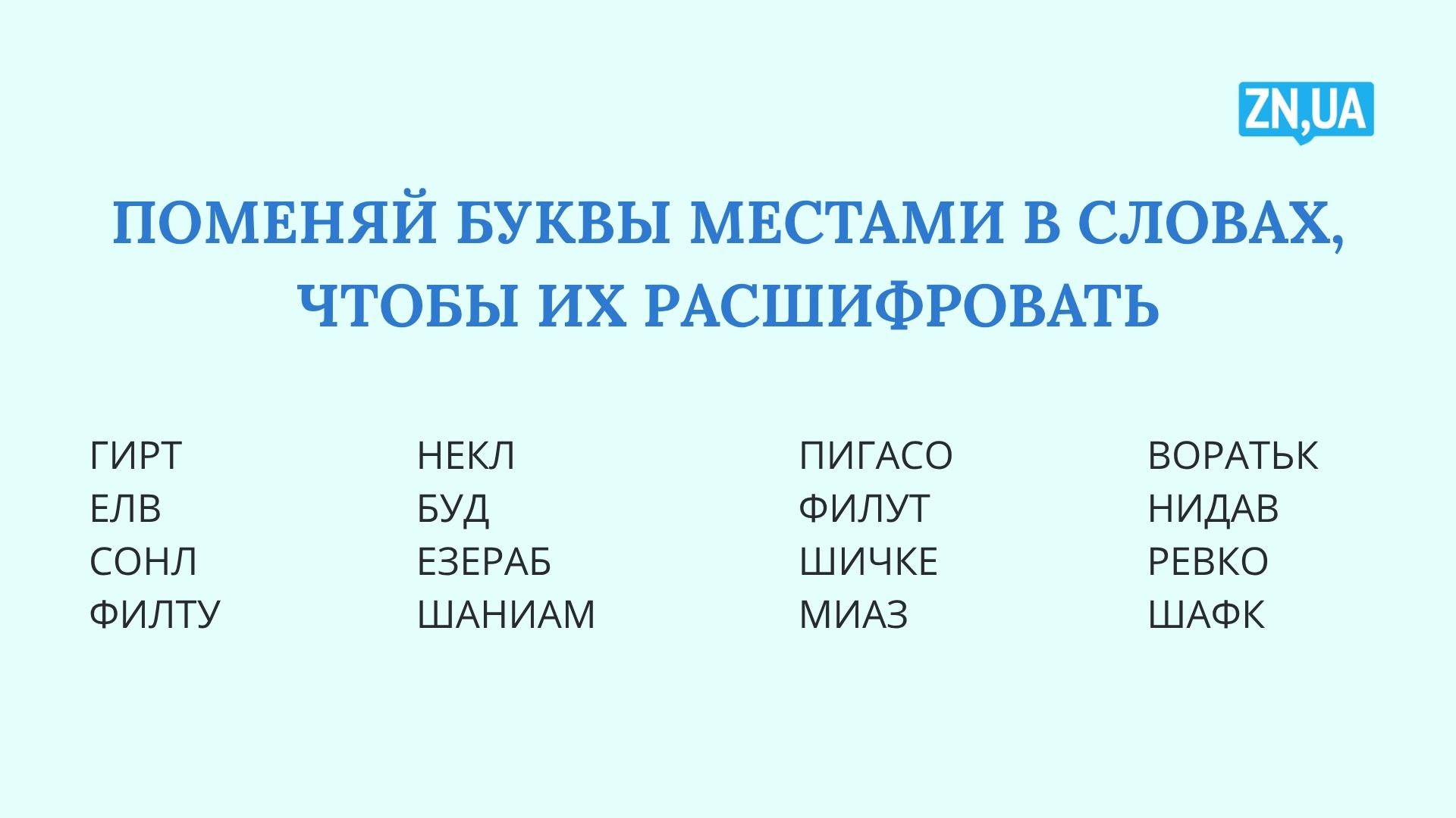 Поменяй местами буквы в словах, чтоб их расшифровать: