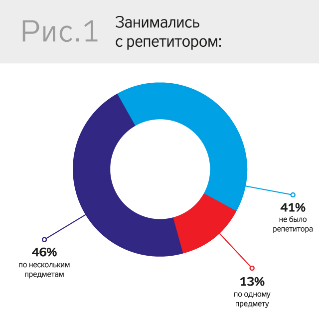 Насколько популярны услуги репетиторов? Среди участников опроса 13% имели репетитора по одному предмету, 46 - по нескольким, вообще не занимались дополнительно - 41%.
