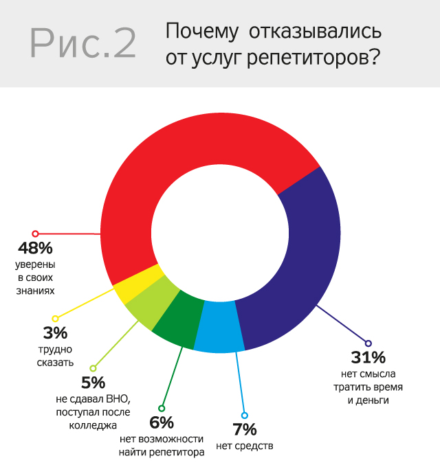 Почему остальные отказывались от репетиторов? Поскольку были уверены в своих знаниях - 48%, не видели смысла тратить время и деньги - 31%, хотели, но не имели на это средств, - 7%, не было возможности найти репетитора - 6%.