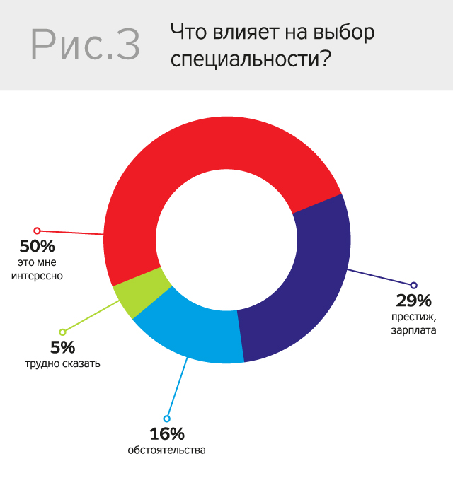 А вот выбор университета выглядит далеко не таким мотивированным. Престижность вуза и убежденность, что диплом этого университета обеспечит хорошую работу, - такими критериями руководствовались только 28% респондентов. Уверенность в высоком качестве образования в выбранном вузе имела значение всего для 15%. Вместе с тем советы родителей или друзей повлияли на выбор 22%, удобное расстояние или желание учиться вместе с друзьями - 17%, более высокие шансы попасть на бюджет - 11%.