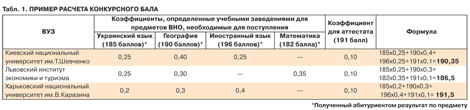 Весовые коэффициенты к каждому предмету ВНО, аттестата и творческих конкурсов в различных высших учебных заведениях могут отличаться, однако их сумма должна равняться единице. Попробуем объяснить, как это будет работать. Например, абитуриент решил поступать на направление подготовки "туризм" и выбрал для себя три вуза, указанные ниже. Изучив правила приема в каждом из них, поступающий сдал ВНО по четырем предметам. Как видим, для этого направления вузы выбрали разные предметы: одни - иностранный язык, другие - математику. Следовательно, получив результаты ВНО и зная коэффициенты, абитуриент может самостоятельно определить свой конкурсный балл в каждом вузе (табл.1).
