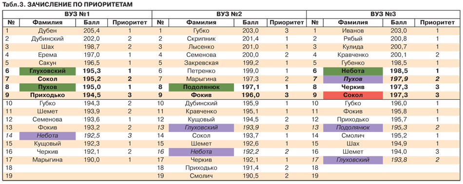 Для примера возьмем произвольные рейтинговые списки поступающих по трем высшим учебным заведениям (ограничимся первыми 25 абитуриентами в рейтинговом списке; предположим, что в каждом вузе есть по девять мест государственного заказа, и нет лиц, поступающих "вне конкурса") [табл.2].