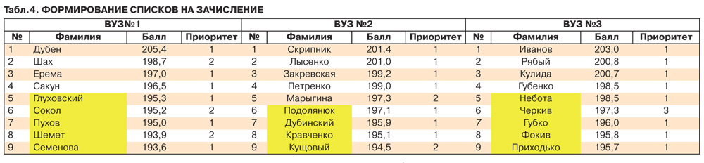 В этом году каждый поступающий будет рейтинговать заявление, поэтому, если его конкурсный балл будет позволять зачисление на несколько специальностей или в несколько вузов, рекомендация будет составляться только по самому высокому приоритету. Если вернуться к нашему примеру, поступающий Сакун будет рекомендован только в вуз №1, поскольку именно там находится его заявление с самым высоким приоритетом. Что касается поступающего Петренко, то он будет рекомендован к зачислению только в вуз №2, ведь в первом вузе находится заявление с меньшим приоритетом. По идентичной процедуре, Иванов будет рекомендован к зачислению в вуз №3, абитуриентка Марыгина - в вуз №2. Поскольку определенные абитуриенты могут быть рекомендованы по приоритету №1, все заявления этих абитуриентов с более низкими приоритетами не будут браться к рассмотрению во время следующего этапа расчета системой ЕГЭБВО (табл.3).