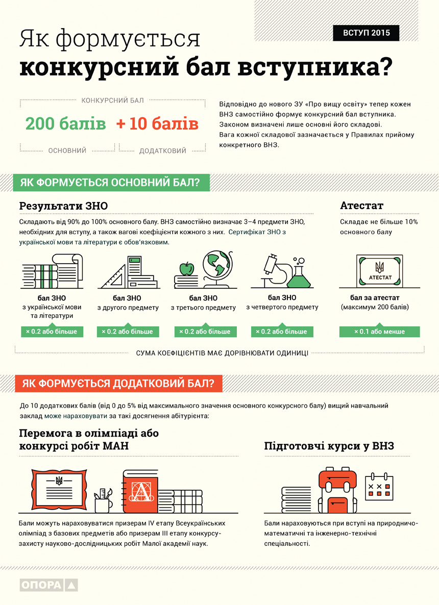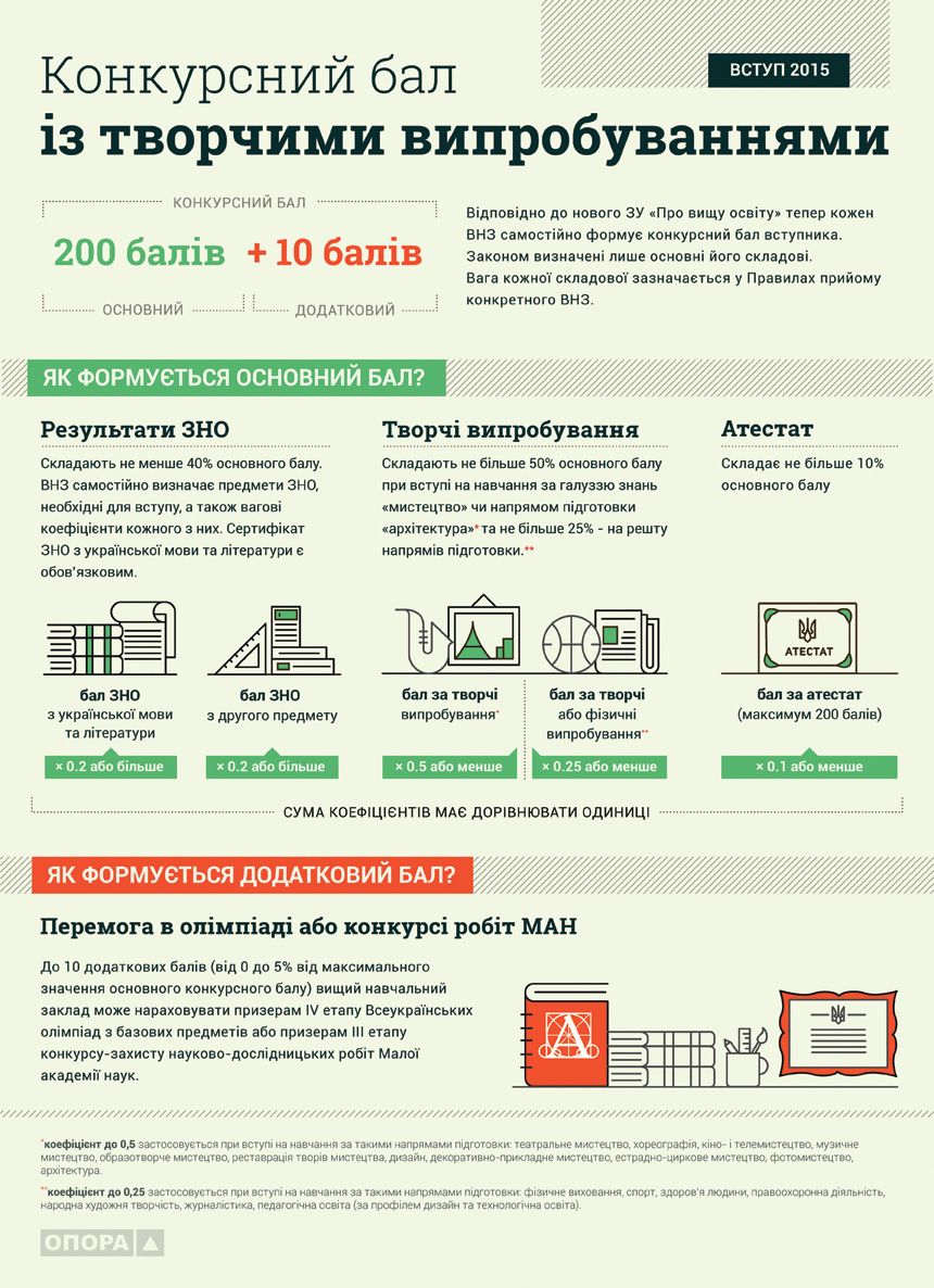 Отдельно хотим остановиться на последнем критерии, который является вторым нововведением этой вступительной кампании, - применение коэффициентов к составляющим конкурсного балла. Если в предыдущие годы конкурсный балл формировался путем простого добавления результатов ВНО, балла за школьный аттестат и творческие конкурсы (когда таковые были) и мог составлять от 800 до 1200 баллов, то в этом году, поскольку результаты ВНО, баллы за аттестат и творческие конкурсы будут умножаться на весовые коэффициенты, он будет составлять максимум 210 баллов, причем на все специальности.