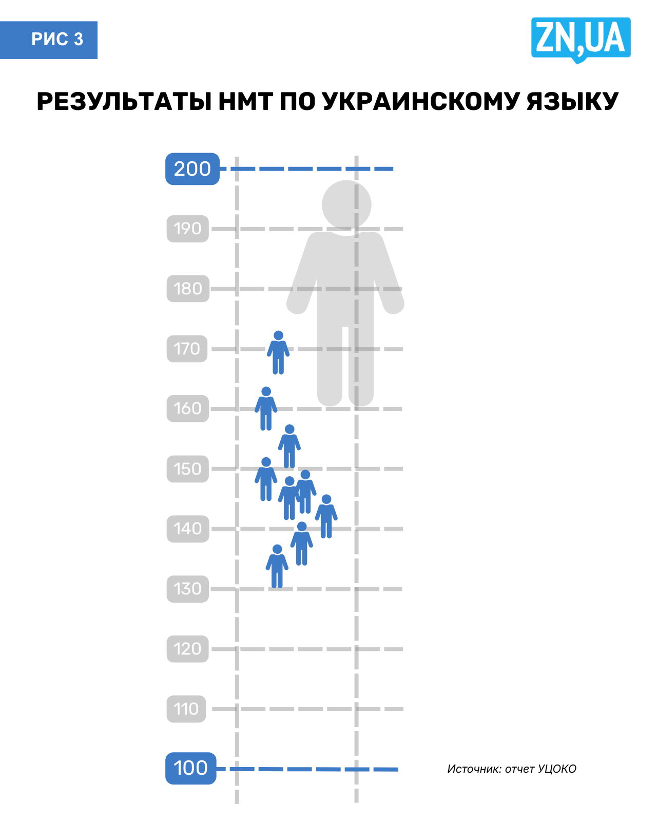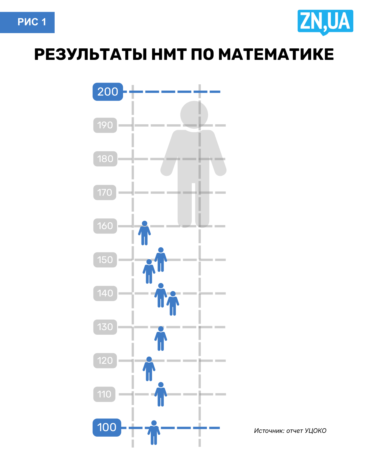 Возьмем результаты по математике и физике. Представим, что шкала 100–200 баллов — это лестница, где каждая ступенька — 10 баллов. А с помощью фигурки человечка обозначим количество участников тестирования, чьи работы анализировали: одна фигурка — это примерно 10% участников. Тогда результаты тестов будут выглядеть следующим образом: