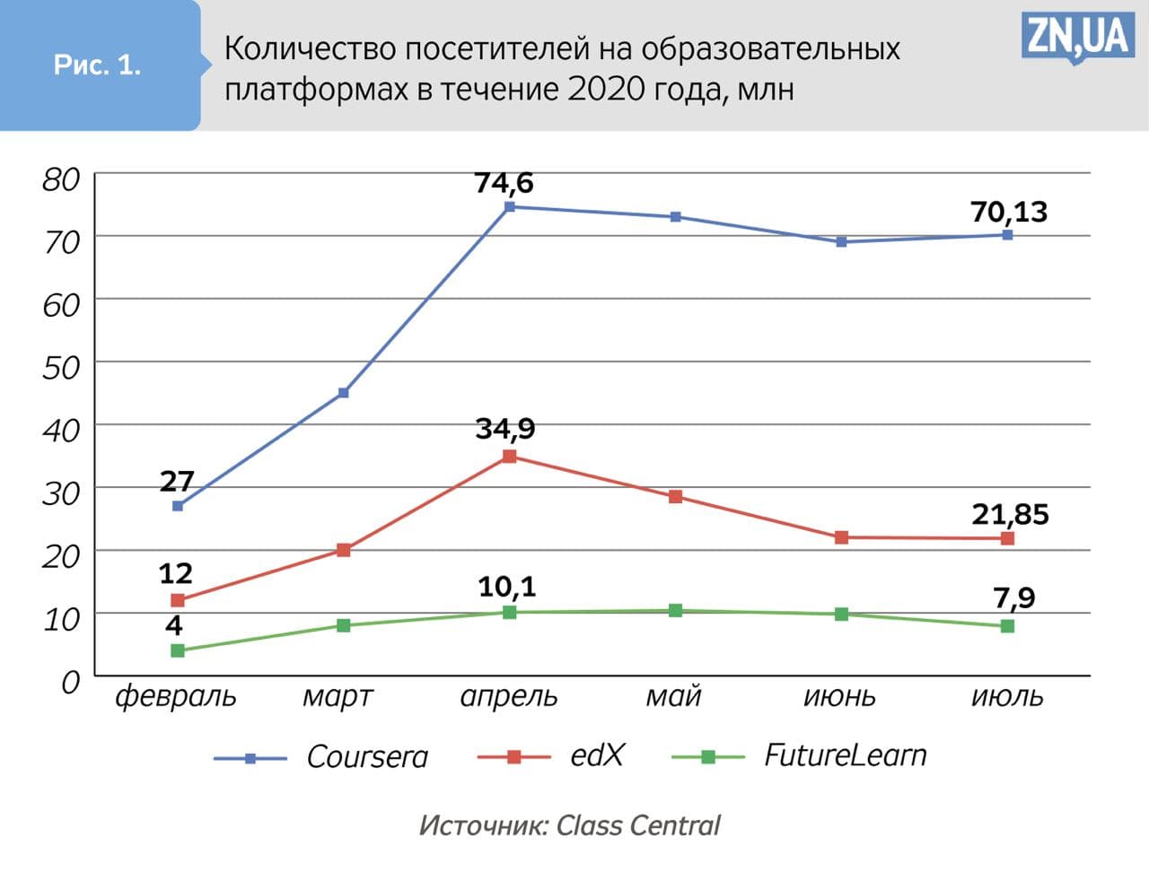 Поскольку отмечается снижение качества образования, все большую популярность приобретают услуги-заменители — онлайн-курсы. Заметно выросла популярность таких образовательных платформ, как Coursera, edX и FutureLearn. Только за 2020 год на этих платформах зарегистрировались почти 32 миллиона новых пользователей, что более чем вдвое больше, чем в 2019-м (14,3 миллиона). На рисунке можно увидеть значительный рост в трафике посещения платформ в течение 2020 года.