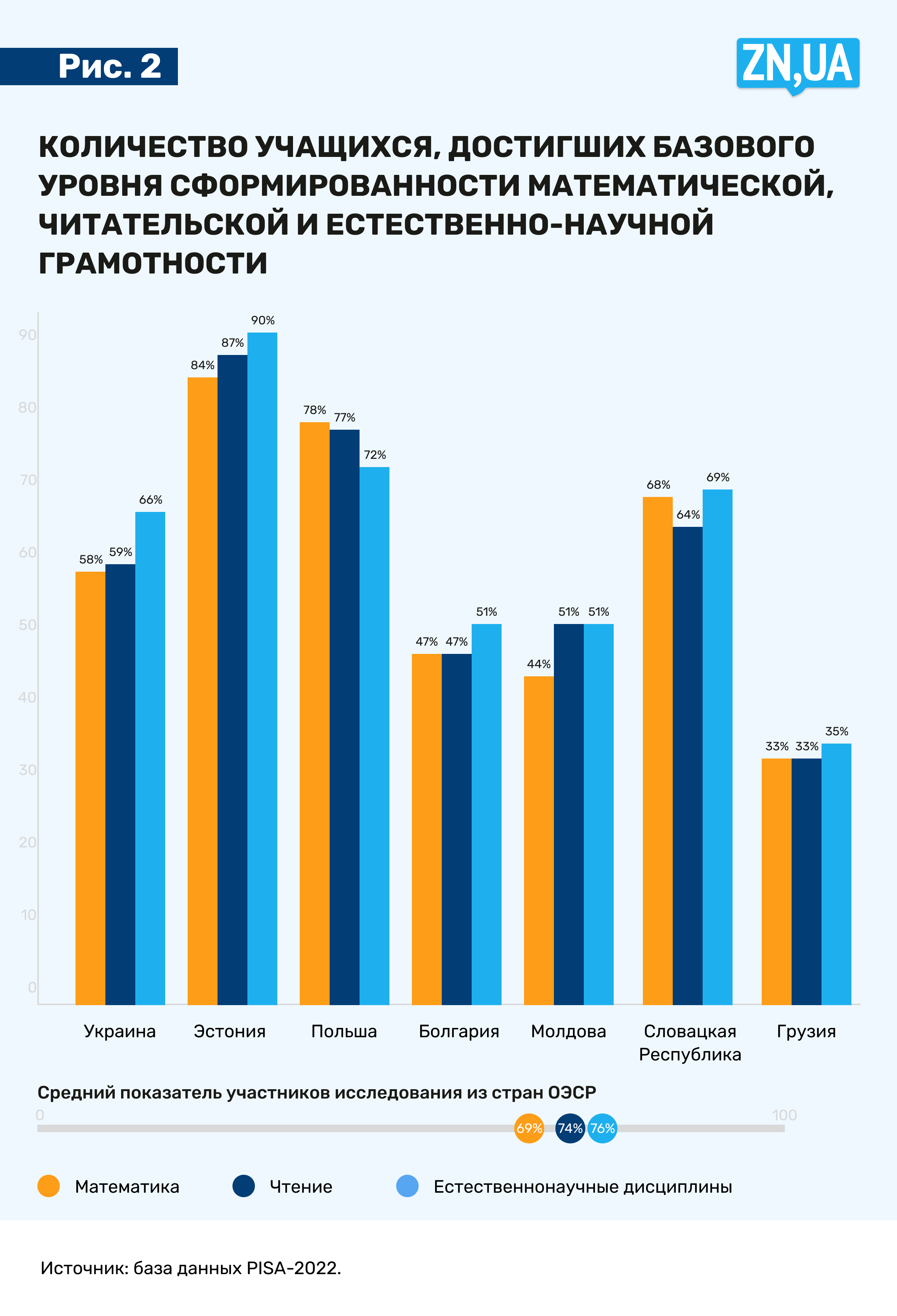Так, базовых знаний по математике в среднем достигли 69% участников исследования. Непосредственно среди украинских детей этот процент составляет 58%. Средний показатель для чтения составляет 74%, в Украине – 59%. В случае с естественно-научными дисциплинами средний показатель составляет 76%, в Украине же он – 66%.