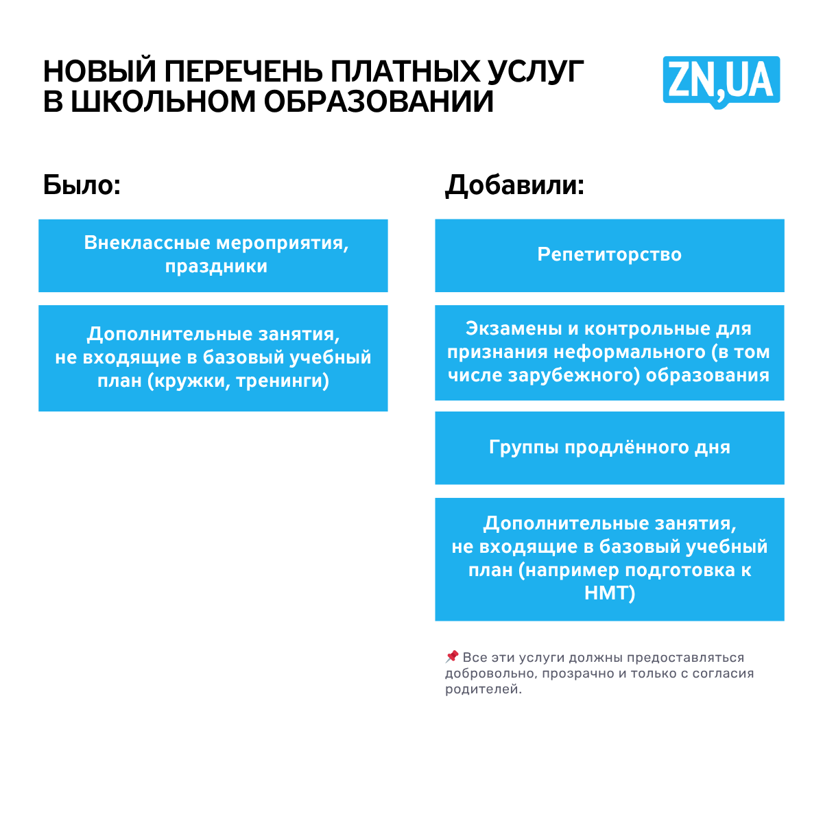 - Платные услуги по базовым программам. Как и в детсадах, есть угроза, что под видом дополнительных услуг школы начнут проводить за родительские деньги занятия, которые обязаны проводить бесплатно. Среди них и платная подготовка к контрольным, отработка пропусков, консультации, наверстывание образовательных потерь или подготовка к НМТ.
