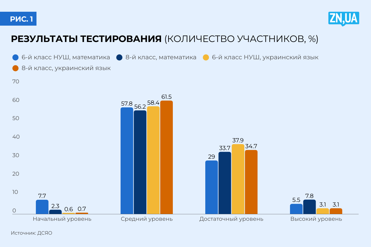 Однако лед тронулся — Государственная служба качества образования начала регулярно мониторить качество знаний учеников этих классов. Уже второй год подряд она проводит «Общегосударственное мониторинговое исследование качества образования в заведениях общего среднего образования в условиях военного положения». В этом году в нем приняли участие более 10 тысяч школьников из 225 школ всех регионов (кроме Севастополя и АР Крым) и всех типов учебных заведений. Они выполняли компьютерные тесты по математике и украинскому языку на платформе Всеукраинской школы онлайн (ВШО). Те, кто учится в школе дистанционно, проходили тестирование дома, остальные — в школе на школьных компьютерах или своих гаджетах.