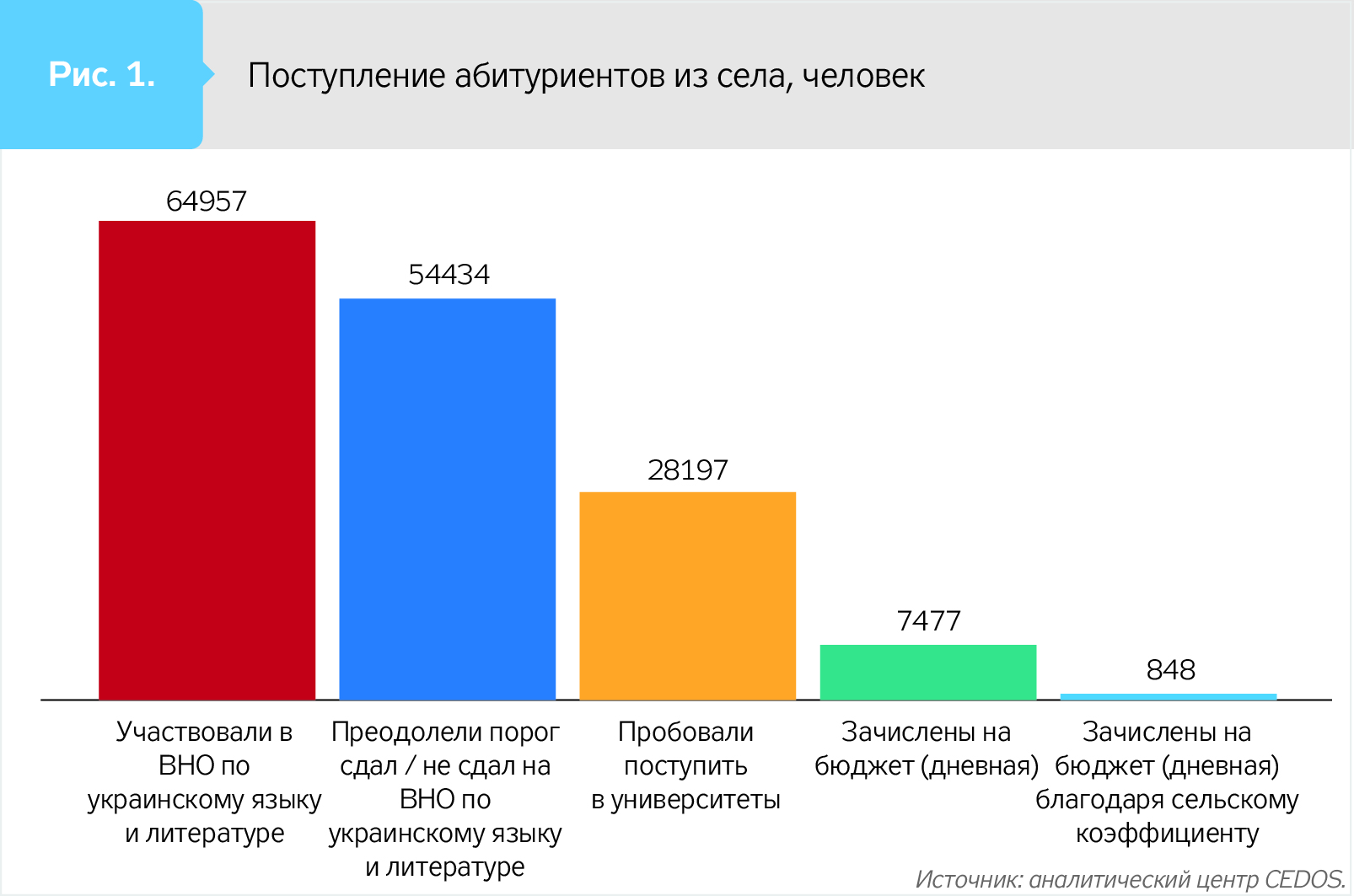 Сельский коэффициент.Его вводили для того, чтобы поддержать детей из села, у которых зачастую нет возможности получить качественное образование. Но, по данным CEDOS, этот коэффициент прошел мимо большинства сельских детей. Прежде всего потому, что 55% выпускников сельских школ даже не пытались поступать в университеты: кто-то не одолел ВНО, кто-то поступал в колледжи, техникумы и профтехучилища, а кто-то просто никуда не поступал. Следовательно, этих детей никто никак не поддержал?