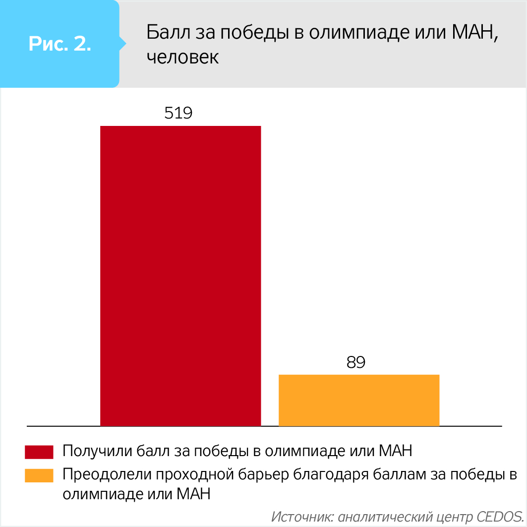 По данным CEDOS, только 17% олимпиадников и МАНовцев нуждались в дополнительных баллах, чтобы стать студентами. В абсолютных цифрах это выглядит так: 519 абитуриентов, зачисленных на бюджетные места, получили дополнительные баллы за олимпиады или МАН. Из них 89 абитуриентов не преодолели бы проходной барьер без этих дополнительных баллов. Большинство из них поступило на факультеты международного права, международных отношений, международных экономических отношений (54 поступающих из 422 мест этой отрасли) и права, где проходной барьер был самым высоким - 189–194 балла. Остальные 430 поступающих попали бы на бюджет и без дополнительных баллов за олимпиады и МАН.