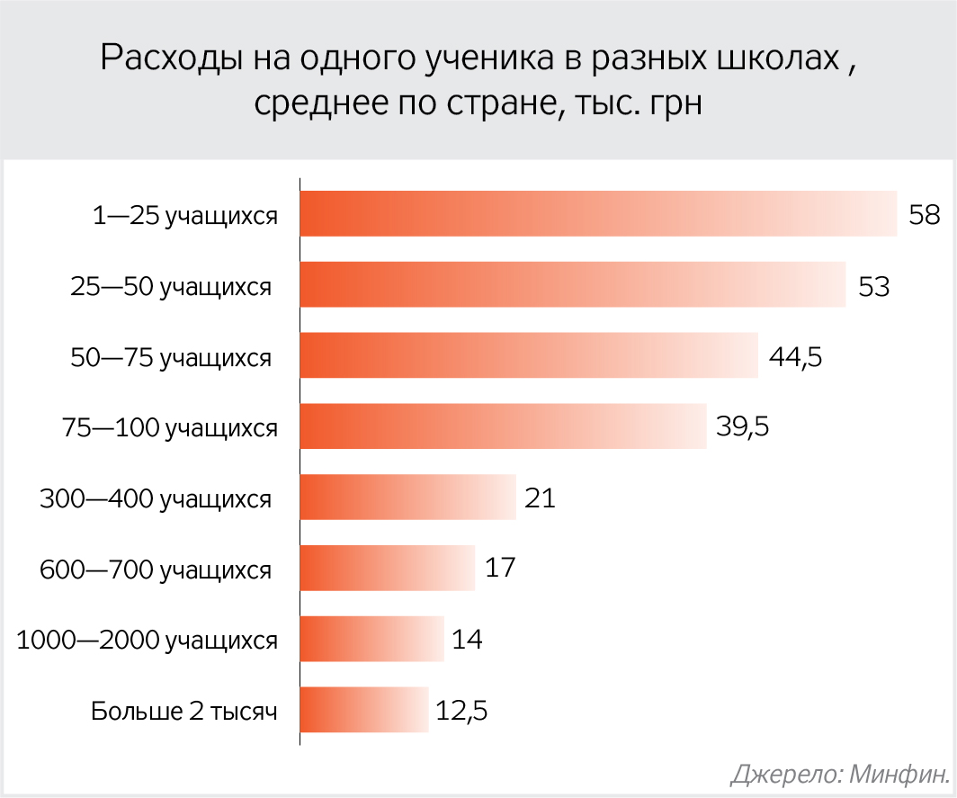 По данным Минфина, всего у нас в стране 14 тыс. 771 школа. Из них 2 тыс. 428 имеют до 50 учеников. Больше всего таких школ в селе. Теперь посмотрим, во что это обходится государству (см. рисунок).