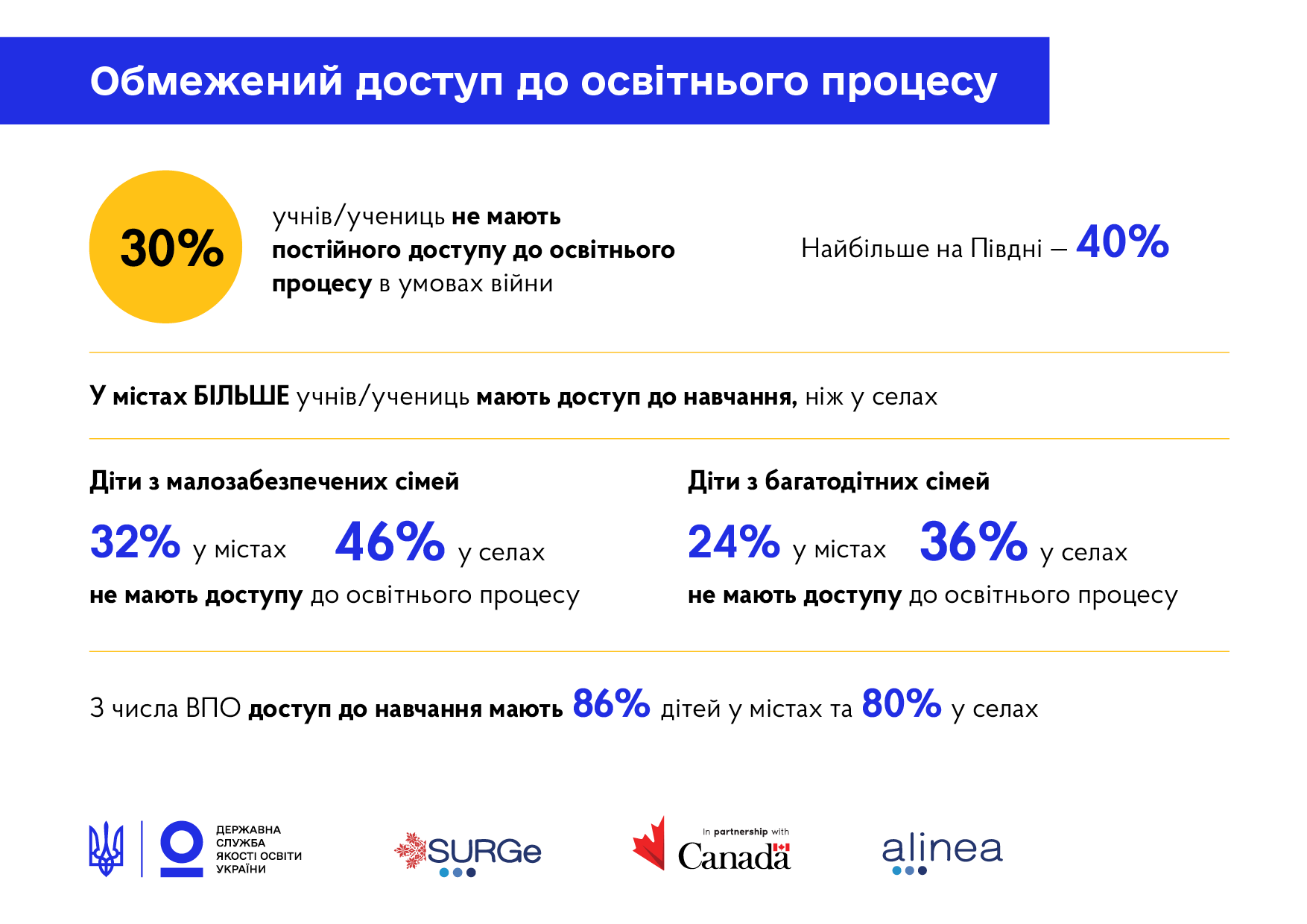 При этом треть детей в условиях войны не имели полноценного доступа к образовательному процессу. Ситуация с доступом к образованию в городах лучше, чем в селах, однако 32% детей из малообеспеченных семей в городах и 46% в селах не имели доступа к образовательному процессу. Среди внутренне перемещенных доступ к обучению имели 86% детей в городах и 80% в селах.