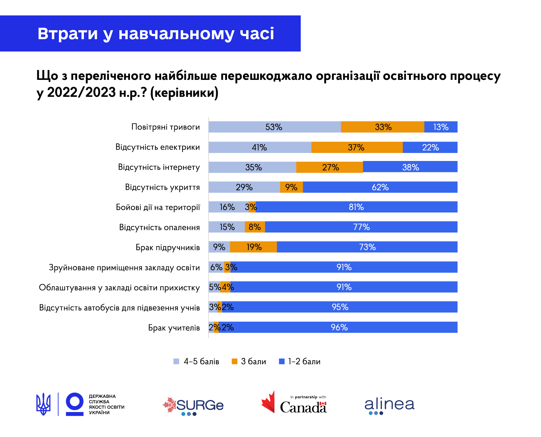 Исследование проведено в декабре 2022 - январе 2023 Государственной службой качества образования Украины при поддержке проекта «Сопровождение правительственных реформ в Украине» (SURGe). «Сопровождение правительственных реформ в Украине» (SURGe) является проектом международной технической помощи, реализуемой кампанией Alinea International и финансируемой Правительством Канады.