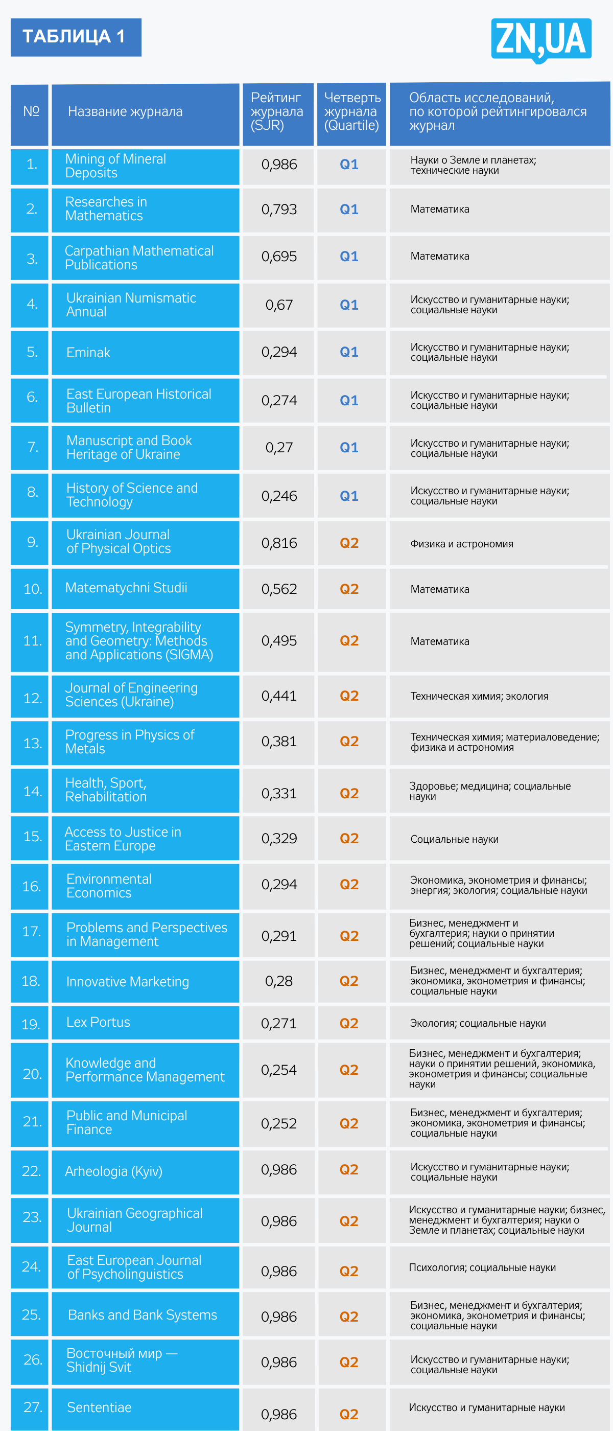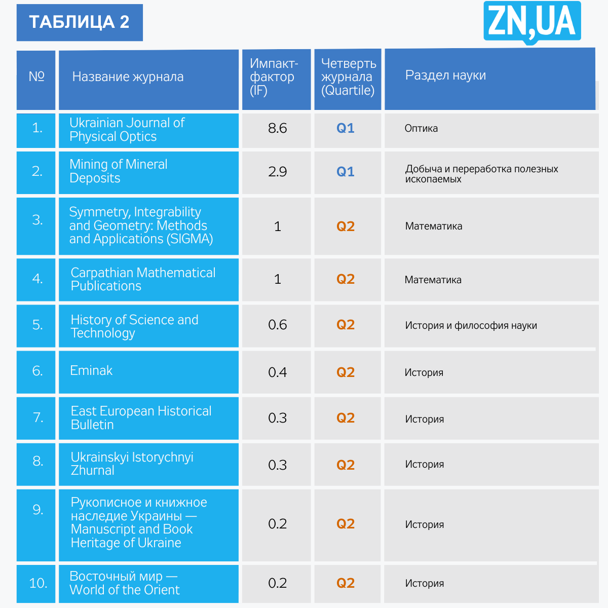 Можно заметить, что девяти журналам присвоено Q1 или Q2 одновременно двумя самыми авторитетными наукометрическими базами. Следовательно, можно с уверенностью утверждать, что в Украине есть девять научных журналов высокого научного уровня. Следует подчеркнуть, что большинство из них — это журналы, специализирующиеся на гуманитарных науках, в частности на истории. Очевидно, что интерес в мире к украинской исторической науке обусловлен полномасштабной агрессией России.