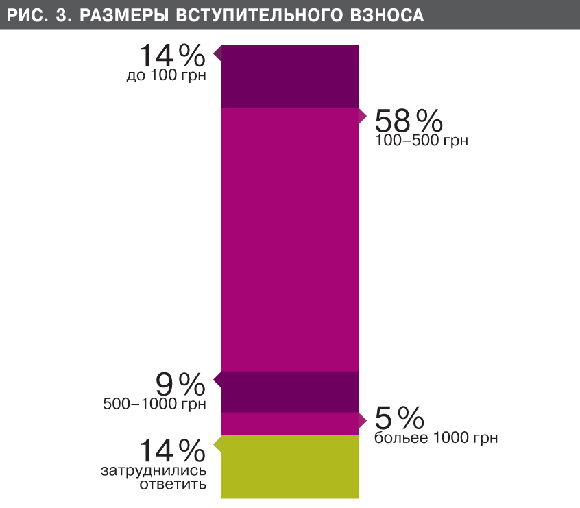 По данным исследования ERA, уплата вступительного взноса во время зачисления в школу - ограниченная практика (76% респондентов отметили, что в их школе такого взноса нет). Его средняя сумма - от 600 до 700 грн. Юрий Шукевич сказал, что лично знает столичную школу, даже не входящую в двадцатку лучших, вступительный взнос в которой еще два года назад достигал 900 евро.