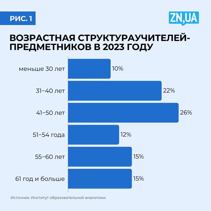В Украине среди учителей-предметников мало молодежи. Количество педагогов до 30 лет по сравнению с другими возрастными группами стремительно уменьшается: за последние два года на 22%. Число учителей в возрасте 41-50 лет уменьшилось на 15%, отмечает основательница общественного союза "Освіторія" Зоя Литвин в статье "Почему в школах не хватает учителей? Результаты исследования".
