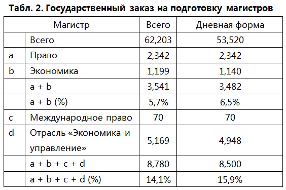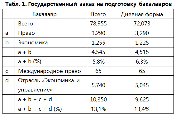 Места на специальности "экономика" и "право" составляют примерно 6% от общего количества мест государственного заказа. Можно также к этой категории добавить специальность "международные отношения" и все специальности отрасли "экономика и управления", тогда доля возрастает до 13–16% (в зависимости от уровня и формы получения образования), однако отнюдь не достигает показателя 30%.