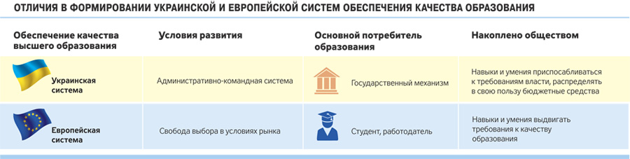 Украинская система обеспечения качества образования своими корнями уходит в советское прошлое, когда контроль качества осуществлялся административно-командными методами. Европейская система образования, наоборот, формировалась в условиях естественного выбора, когда требования к качеству образования выдвигают непосредственные потребители образовательных услуг - отрасли, работодатели, студенты.