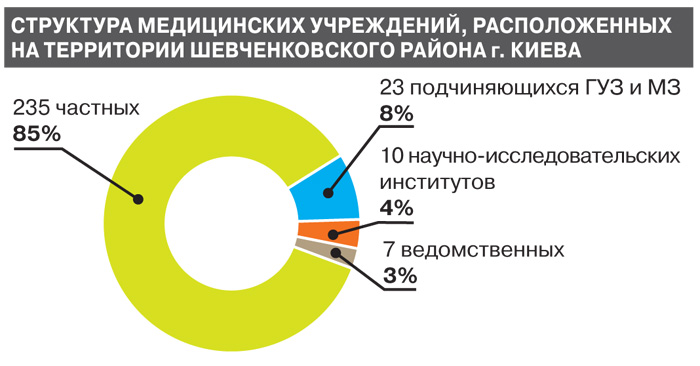 Стратегия развития столицы включает и проведение медицинской реформы, которая должна обеспечить "увеличение продолжительности жизни киевлян на 7 лет - с 71–72 до 78–79". Минздрав, в свою очередь, обещал, что улучшение медпомощи люди реально почувствуют в конце 2012 - начале 2013 г. Этому, в частности, будет способствовать увеличение подушного финансирования, которое произойдет после сокращения лишних койко-мест и закрытия больниц. А много ли на самом деле "лишних"? Структура медицинских учреждений того ж таки Шевченковского района выглядит сегодня так: 85% - частные, 8% - принадлежат Минздраву и городу, 3% - ведомственные, 4% - институтские клиники.
