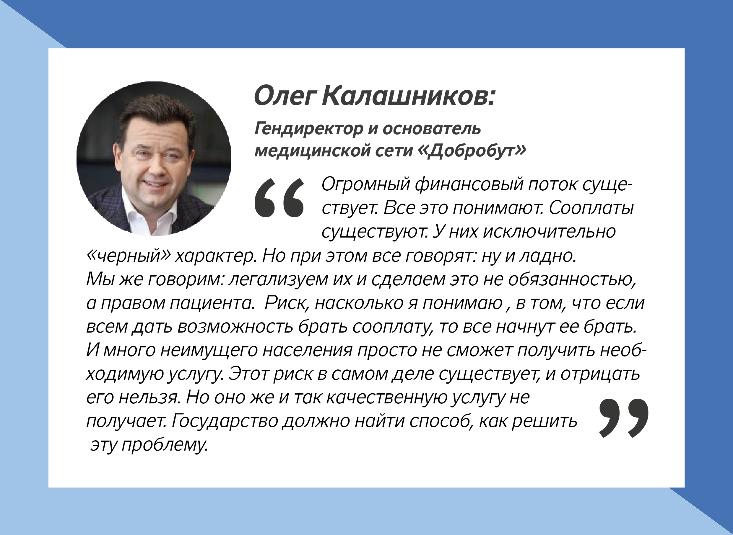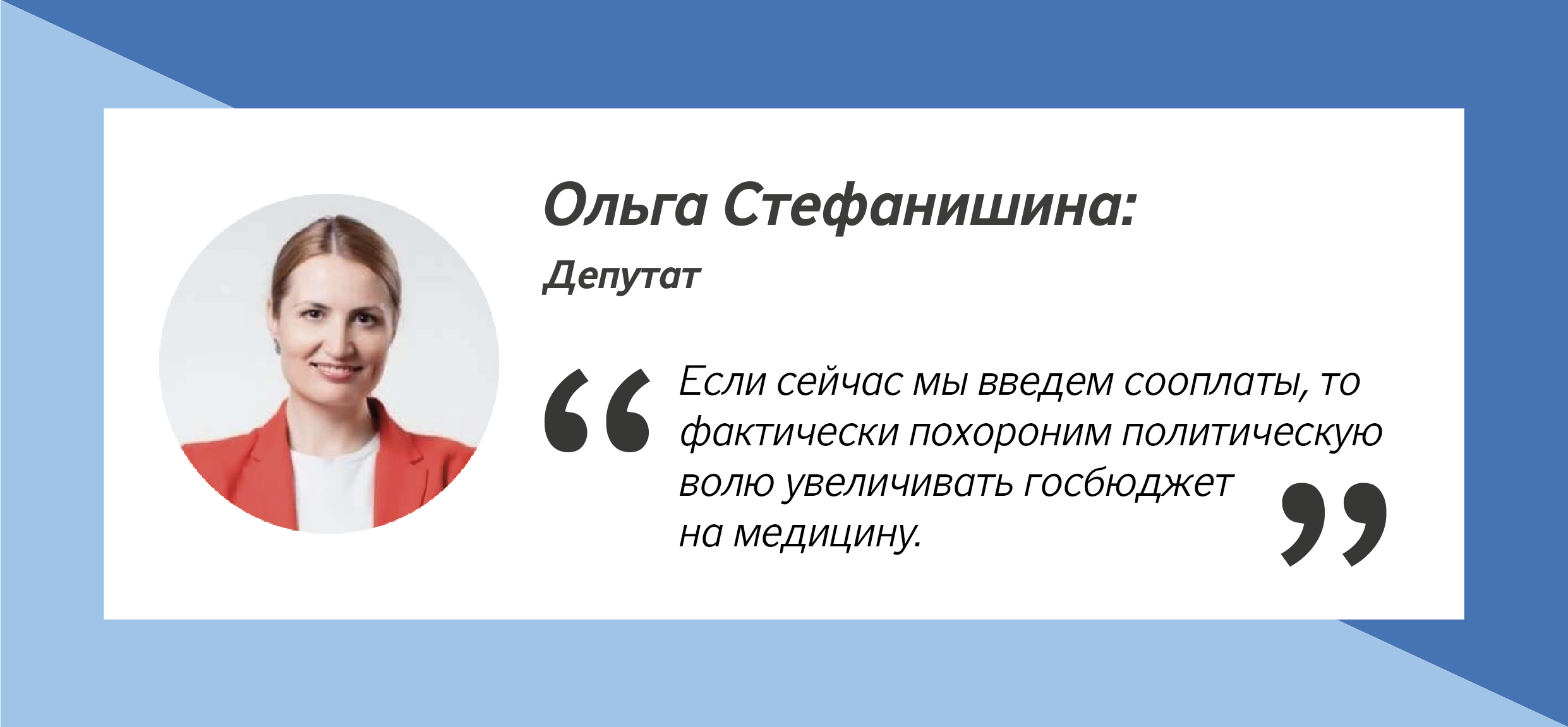 Следовательно, чтобы ввести сооплату в таком виде, надо менять несколько законов. Кроме того, это создает конфликт с Конституцией, в которой речь идет о бесплатной медпомощи. Сооплатами же людей заставляют за нее платить.