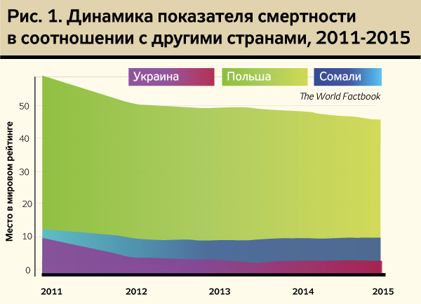 В 2011 г. по просьбе Агентства США по международному развитию (USAID) проводилась системная оценка сильных и слабых сторон здравоохранения Украины. Было установлено, что только за один визит в поликлинику пациент тратил из своего кармана от 20 до 40 долл., в зависимости от количества хронических болезней. Необходимость стационарного лечения (в разы дороже) ставит перед человеком выбор (с 1 января 2015 г. прожиточный минимум составляет 1218 грн ≈ 57 долл.) - умереть от голода или от болезней. Суммарная стоимость минимального обследования в частных медицинских центрах Винницы - общего анализа крови (110 грн), общего анализа мочи (90 грн) и первичной консультации терапевта (120 грн) - около 320 грн, то есть 25% от прожиточного минимума без учета стоимости лекарственных средств. По итогам исследований The World Factbook (Центральное разведывательное управление США), уже три года подряд Украина находится среди лидеров по показателю смертности.