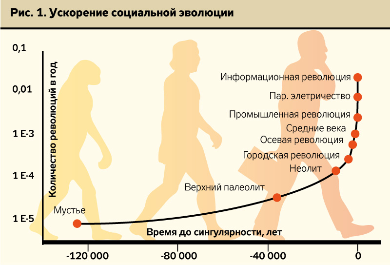 Если говорить о социальной эволюции, то серия независимых расчетов, проведенных учеными разных стран и разных специальностей, показала, что эволюционные процессы ускорялись, и около середины