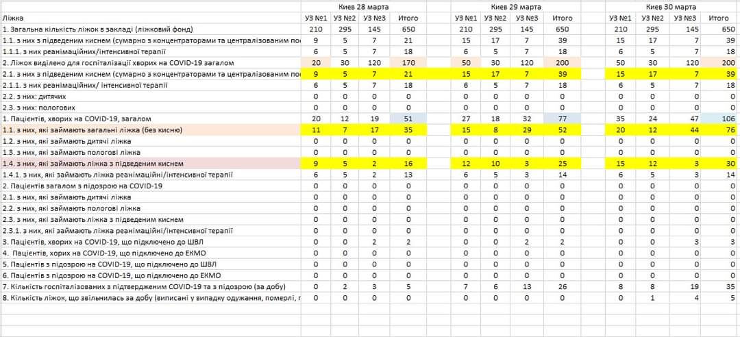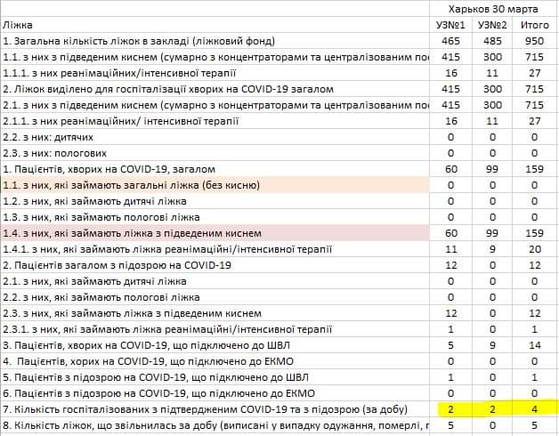 — Нет, это не совсем достоверная информация. У меня есть ежедневные таблицы от гендиректоров о количестве пациентов, а также тех, кто находится на концентраторах и в реанимации. На 23 марта во Львове было 48 пациентов. В 1-й больнице Харькова — 70, из них девять — в реанимации и 58 — на концентраторах. Во 2-й больнице — 73. Коек с концентраторами занято 73, в реанимации — шесть пациентов.