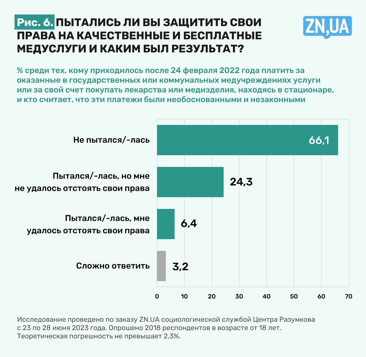 «Пациенты не должны молчать в случае нарушения их прав и требования средств за медицинские услуги и лекарственные средства в рамках программы медицинских гарантий», — заявляет НСЗУ. «Пытались ли вы защитить свои права на качественные и бесплатные медуслуги и каким был результат?» (см. рис.6) — спросили мы у тех, кому приходилось после 24 февраля 2022 года платить за оказанные в государственных иди коммунальных медицинских учреждениях услуги или за свой счет покупать лекарства или медицинские изделия, находясь в стационаре, и кто считает, что эти платежи были необоснованными и незаконными.
