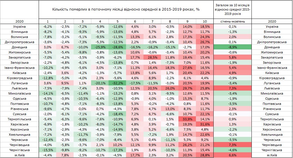 22 декабря Госкомстат опубликовал показатели смертности в разрезе областей. В октябре наибольший рост смертности был зафиксирован в областях с крупными городами-миллионниками — в Киеве, Харькове, Днепре, Львове. Так, по сравнению с пятилетними средними показателями в октябре, рост смертности составил в Харьковской области +31,6%, в Киеве — +28,8%, в Днепропетровской области — +26,7%, во Львовской — +25,8%.