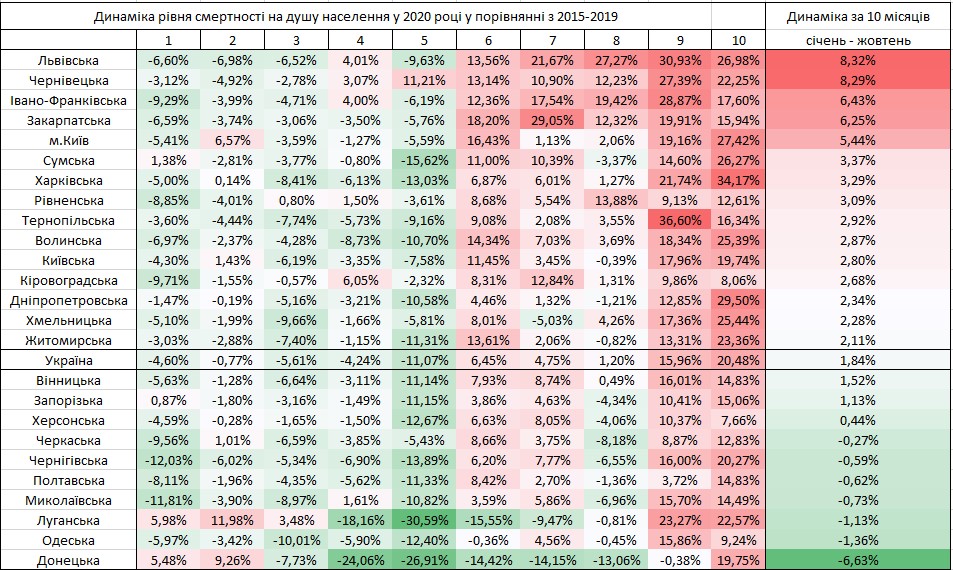 В абсолютном выражении наибольшая избыточная смертность была в Днепропетровской (1168 человек) и Харьковской (1129) областях. Всего по Украине избыточные смерти составили 9205 случаев.
