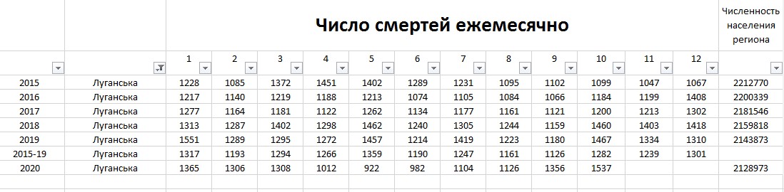 Здесь мы видим парадоксальные цифры. Прежде всего в глаза бросается снижение смертности в Донецкой и Луганской областях на 27–30%, особенно с марта по август в Донецкой области. Цифры удивительные. Таблетки от бессмертия пока никто не изобрел, и потому смертность не может вдруг снизиться на 25–30%.