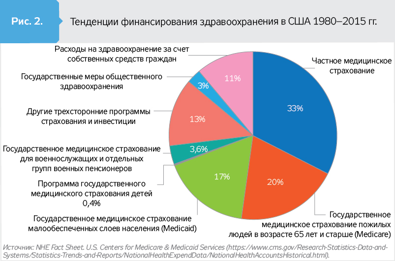 Модель функционирования и финансирования системы здравоохранения в США построена на широкой политической, административной и рыночной децентрализации и доминировании частного медицинского страхования, удельный вес которого в финансировании отрасли составляет около 33% общих затрат на здравоохранение (1,07 трлн долл. США) и является единственной формой страхового покрытия для лиц, не вовлеченных в государственные программы медицинского страхования.