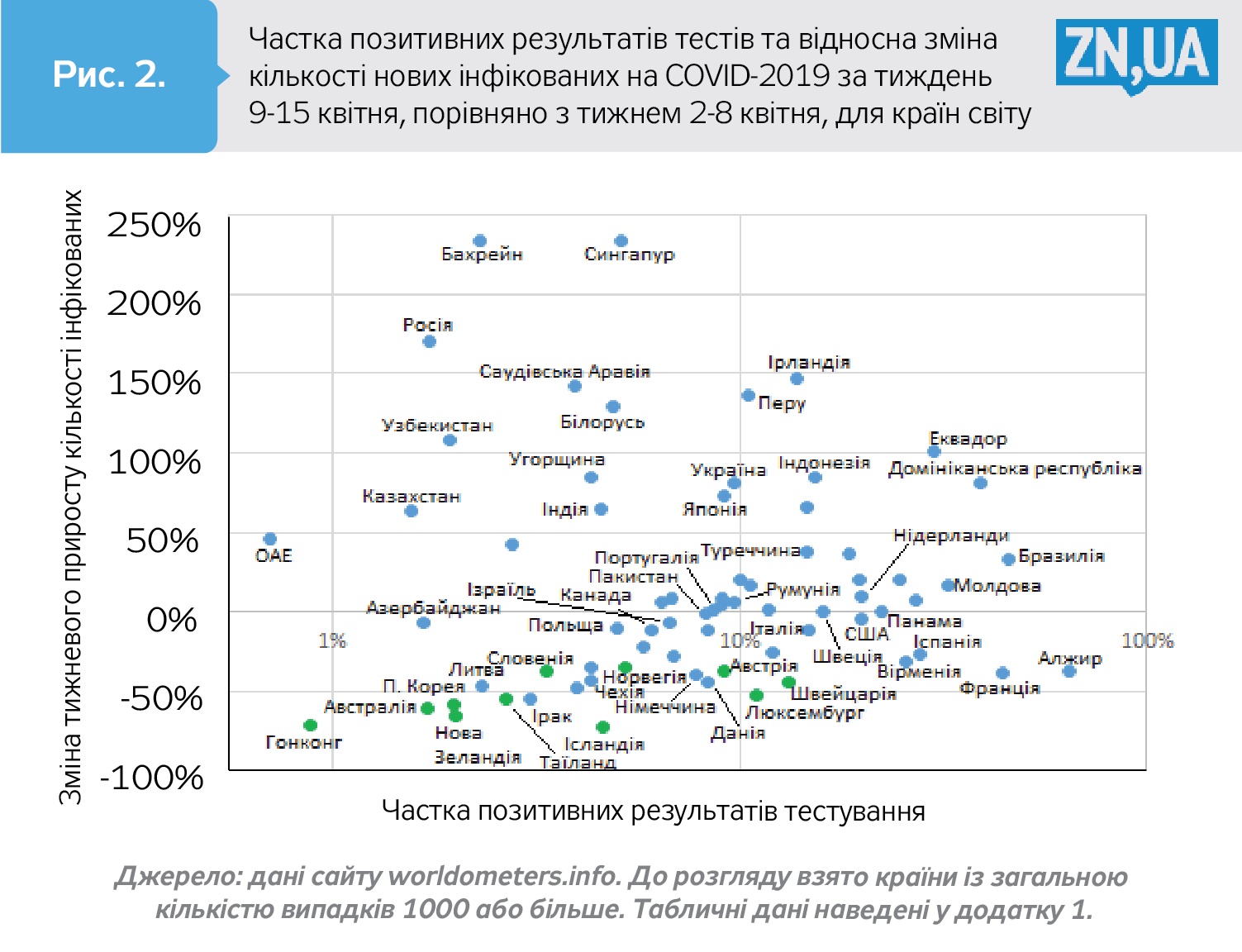 Хотя представленное на рис. 1 и 2 относительное изменение количества новых инфицированных за две рассмотренные недели показывает краткосрочные тенденции в численности новых больных, относительный прирост за неделю 9–15 апреля всего количества инфицированных говорит о долгосрочной динамике. Уровень 15% примерно отвечает ситуации, когда пик заболеваемости в целом остается позади. Страны, в которых за неделю 9–15 апреля количество всех зафиксированных случаев инфицирования выросло менее чем на 15%, обозначены зелеными маркерами. В этих странах уменьшение недельного количества новых случаев заболевания наблюдается, как правило, уже относительно долго.