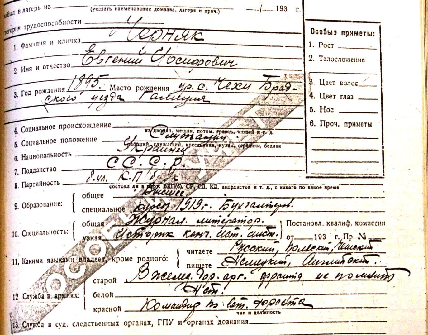 Евгений Иосифович Черняк родился в 1895 г. в селе Чехи на Галичине - так записано в лагерном деле, хранящемся в архивных фондах Управления ФСБ России по Республике Карелия. В конце 1990-х, находясь в служебной командировке в Петрозаводске, я ознакомился с рядом документов об украинцах-соловчанах (это приблизительно около полутора десятка дел) и привез ксерокопии найденных материалов в Киев - для подготовки научно-документального издания. Правда, в известных воспоминаниях Елены Гавричевой, внучки репрессированного, указана другая дата рождения ее деда - 25 декабря 1896 года (см. "Возвращенные имена. Книга памяти России"). Также отметим, что с 1946 года малая родина галичанина носит другое название - теперь это село Луговое Бродовского района на Львовщине.