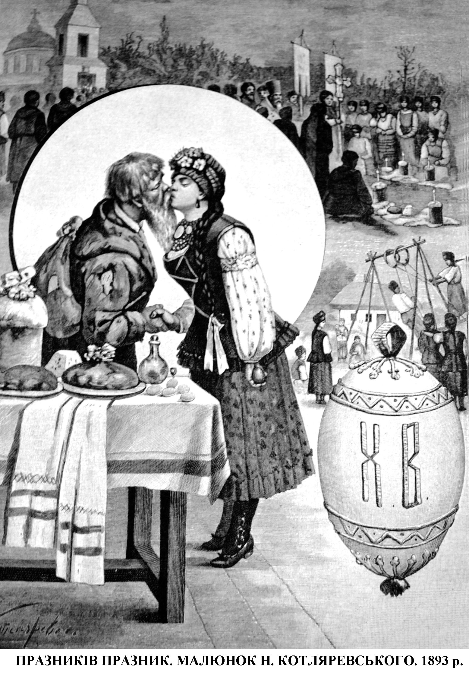 Под конец службы корыта, корзины, полотенца, а то и просто платки с едой образовывают возле церкви сплошной круг. Поросята, колбасы, пасхи, пасхальные яйца, писанки и другие пасхальные яства ждут своей очереди быть окропленными. Под кучей продовольствия, как контрабанда, кое-где притаилась стопочка сивухи, запеканки, варенухи или медовухи, которых хозяин также хочет потешить освящением. Как только вышли хоругвеносцы, и колокола заколотили ускоренным перезвоном, - все стихло...