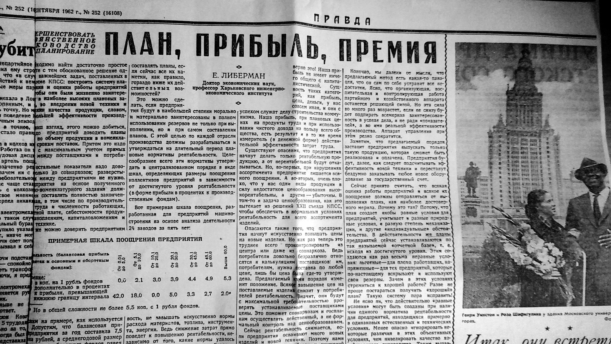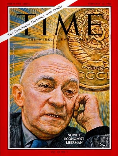 С обложки, подперев голову рукой, на них задумчиво взирал неизвестный пожилой человек - "советский экономист Либерман", как гласила подпись под фото. Более того, основная статья номера под заголовком "Коммунисты заигрывают с прибылью" как раз и была посвящена состоянию советской экономики и роли идей Евсея Григорьевича Либермана в ее реформировании.