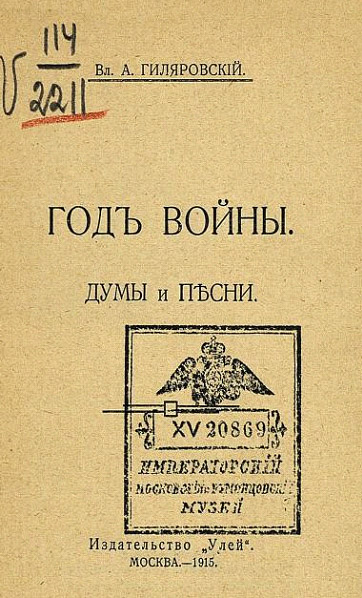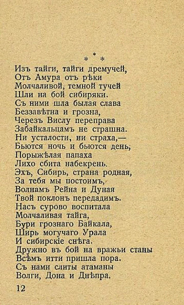 Строки эти были помещены Гиляровским в его стихотворный сборник "Год войны. Думы и песни", вышедший в Москве в 1915 г. Видимо, к сибирякам они попали еще раньше. Рискну предположить, что здесь могла проявиться старая связь "дяди Гиляя" со 137-м Нежинским полком, в составе которого он служил какое-то время в юности. Этот полк прекрасно себя проявил в годы Русско-японской войны, а затем в самом начале Первой мировой войны вошел в состав 17-го армейского корпуса, воевавшего на Юго-Западном фронте.