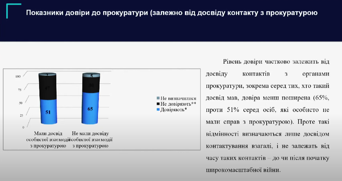 Как отметили авторы, уровень доверия украинцев частично зависит от опыта взаимодействия с органами прокуратуры. Среди тех, кто имел такой опыт, показатель доверия меньше – 51% против 65% среди тех, кто не контактировал с прокуратурой.