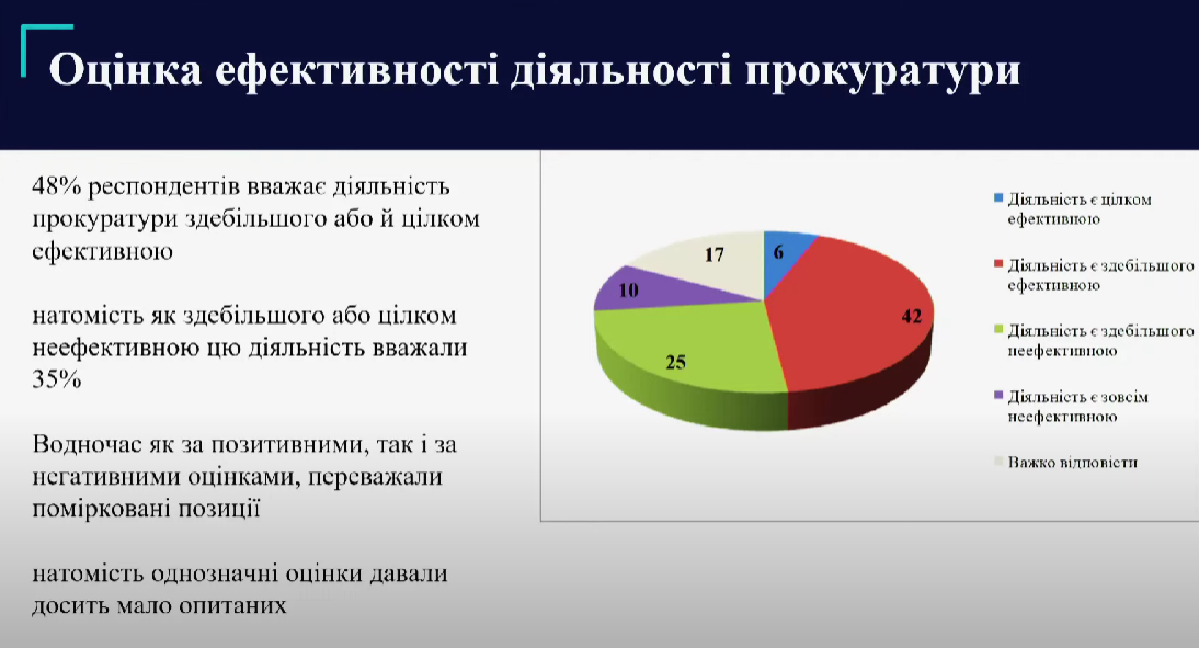 Также людей опросили относительно эффективности работы органа. 42% считают ее в основном эффективной, полностью – только 6%. Преимущественно неэффективной деятельность прокуроров называли 25% участников исследования, для 10% она совершенно неэффективна. Также 17% респондентов не смогли четко ответить на вопрос.